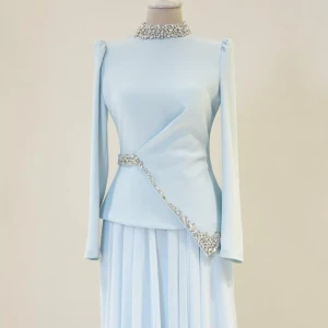 Sparkle from every angle in our crystal Gown. This elegant dress is designed for your most special moments, featuring a structured Crepe top beautifully accented with shimmering crystals, and a dreamy. flow Chiffon skirt Details: •Color Baby Blue • Fabric: Premium Crepe & Pleated Chiffon. • Special Features Crestal embellishments on the neckline and waist. • •Modesty : Fully lined, high neck , and long sleeves .