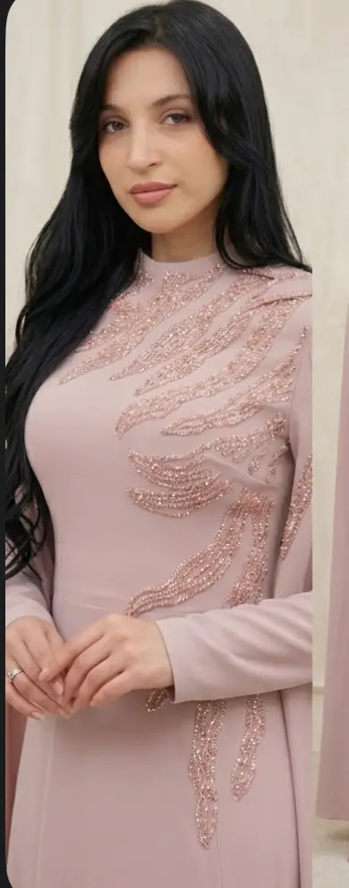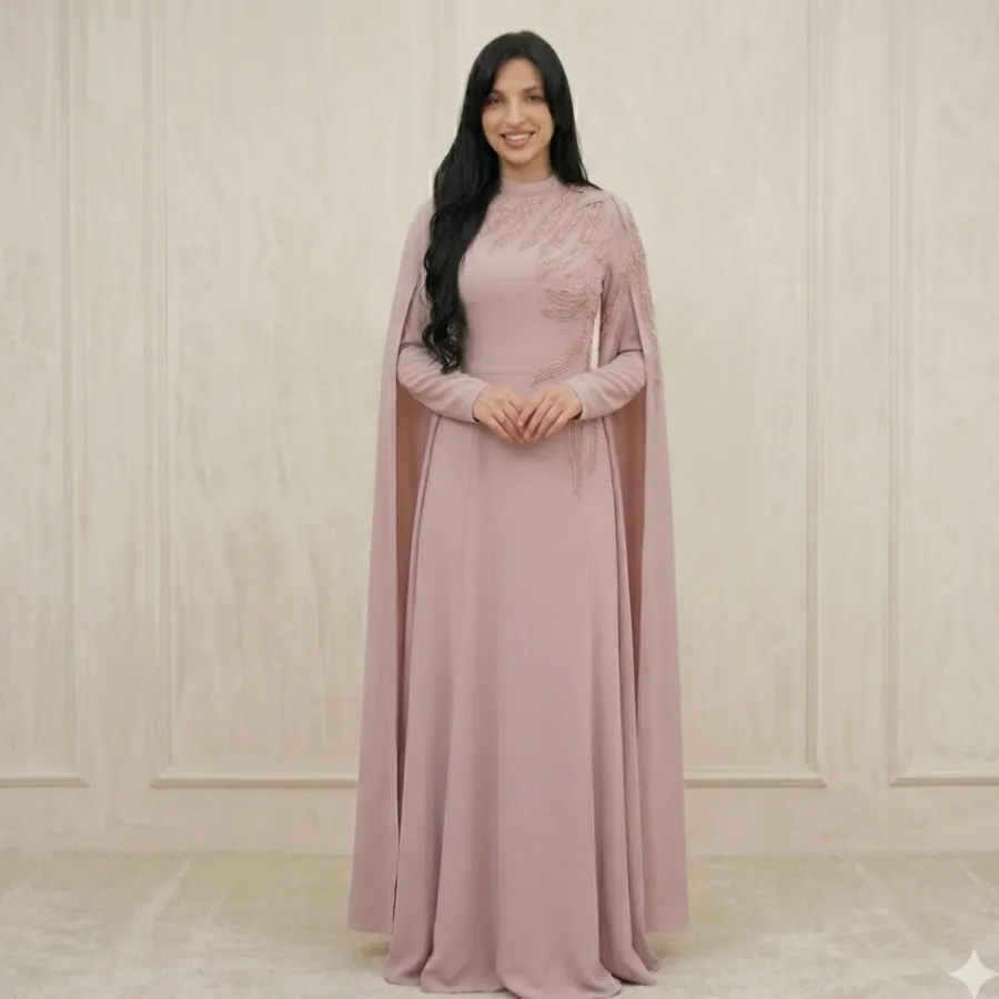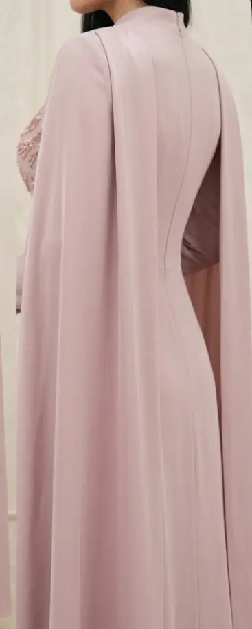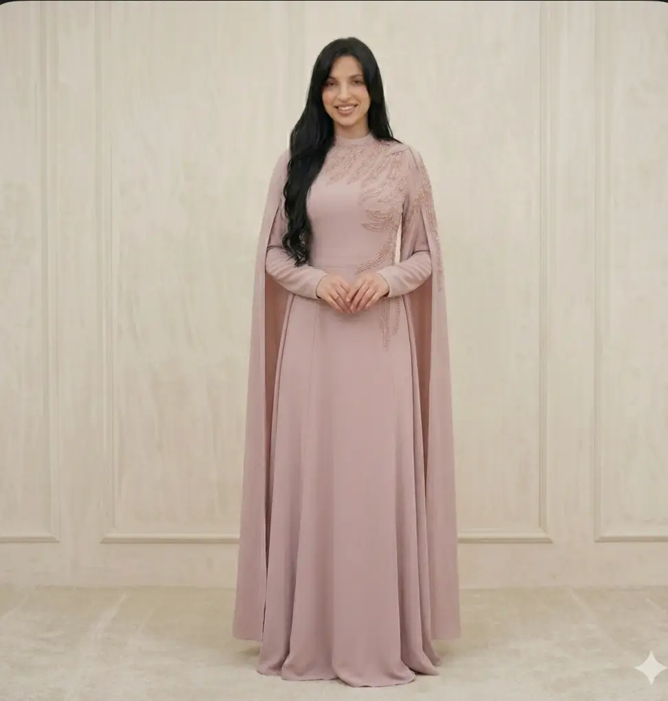 Premium Embroidered Crepe Gown with Cape Sleeves Step into a world of elegance with the Majesty Gown. This dress is designed for a truly regal presence, featuring a structured Crepe bodice with detailed embroidery and dramatic, flowing cape, sleeves that create a stunning silhouette. Product Details: • Fabric: High-quality, non-shiny Crepe for a sophisticated matte lock. • Design: Intricate embroidery on the front and shoulders with majestic cape-style sleeves. • Modesty: Fully lined, featuring a high neck and long sleeves. • Occasion: Perfect for high-end weddings, engagements, and formal evening events.