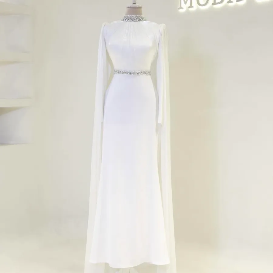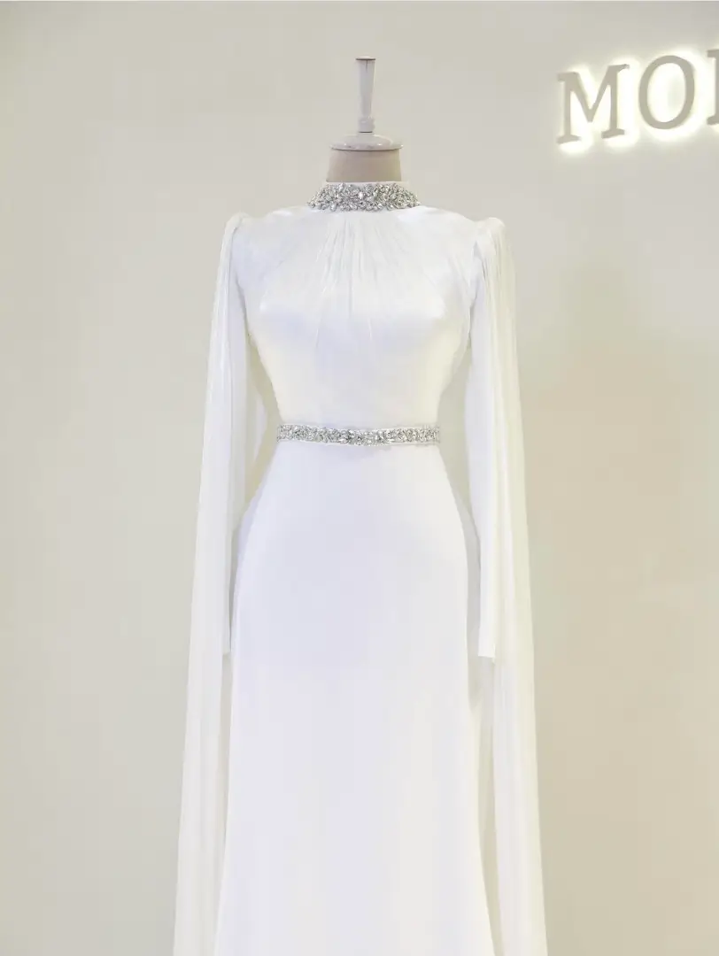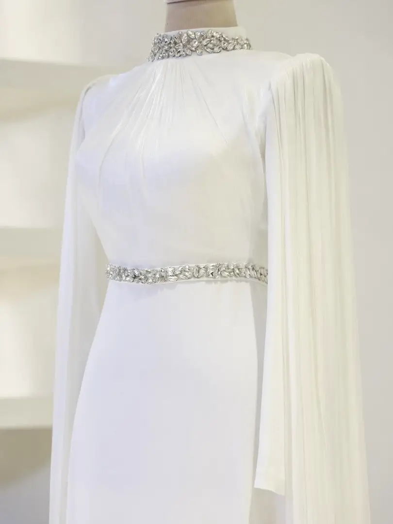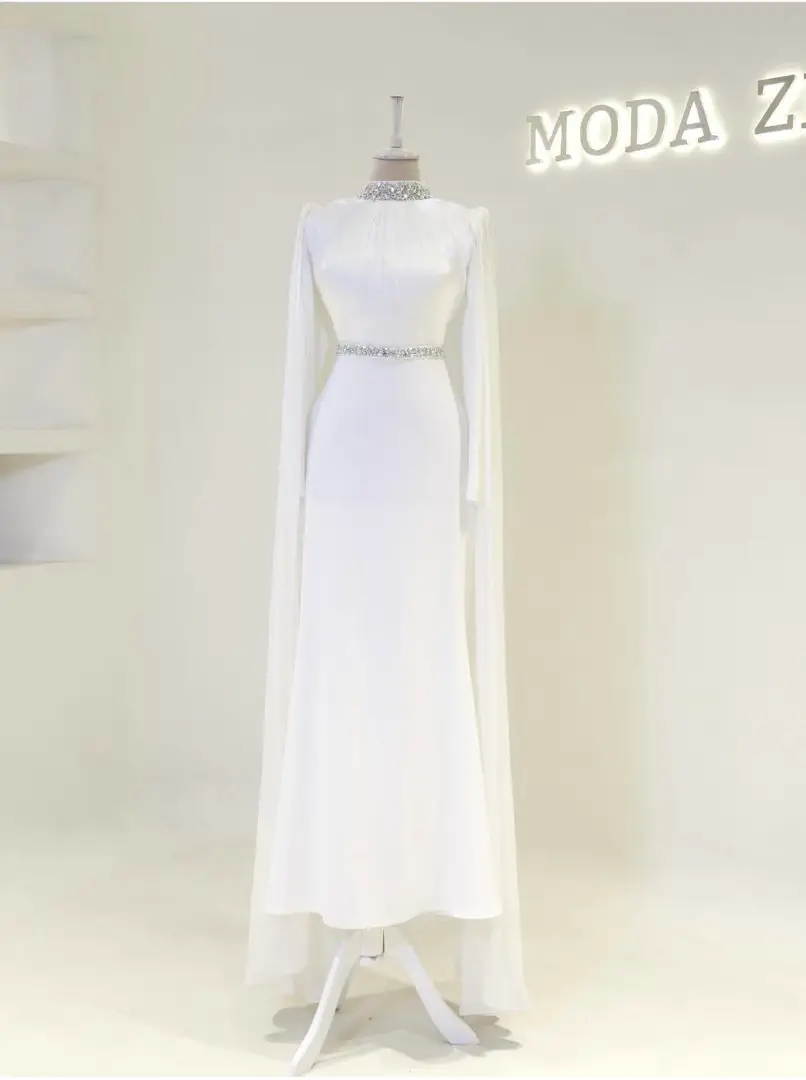 ajestic Flowy Gown with Pleated Chiffon Cape Command the room in our Victoria Gown, a masterpiece of modesty and high-fashion. This breathtaking piece features a sleek, floor-length silhouette with a soft, subtle sheen. It is paired with an extraordinary, floor-sweeping Pleated Cape and adorned with a shimmering crystal-style collar and waist belt for a truly regal presence Color Available: • Ivory White (Pure and sophisticated) Product Details: • Finish: Soft, smooth, and lightweight fabric with a graceful, airy flow. • Design: Attached full-length pleated cape for a dramatic and elegant effect. • Details: Shimmering crystal-style embellishments on the neckline and waistline. • Modesty: Fully lined with a high neck and long sleeves. • Best for: Bridal events, white-tie galas, and high-end formal celebretions.