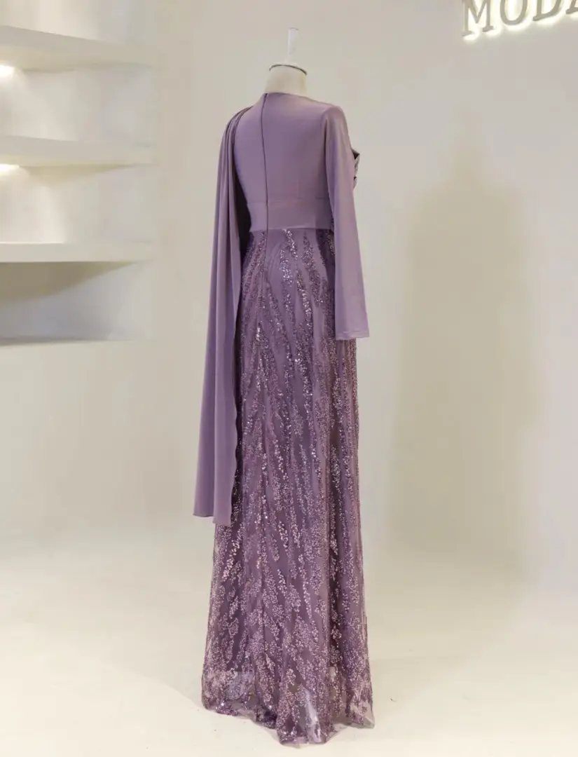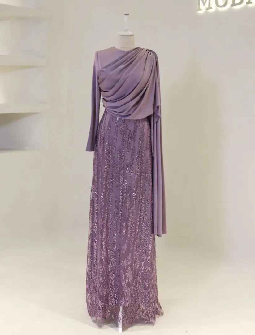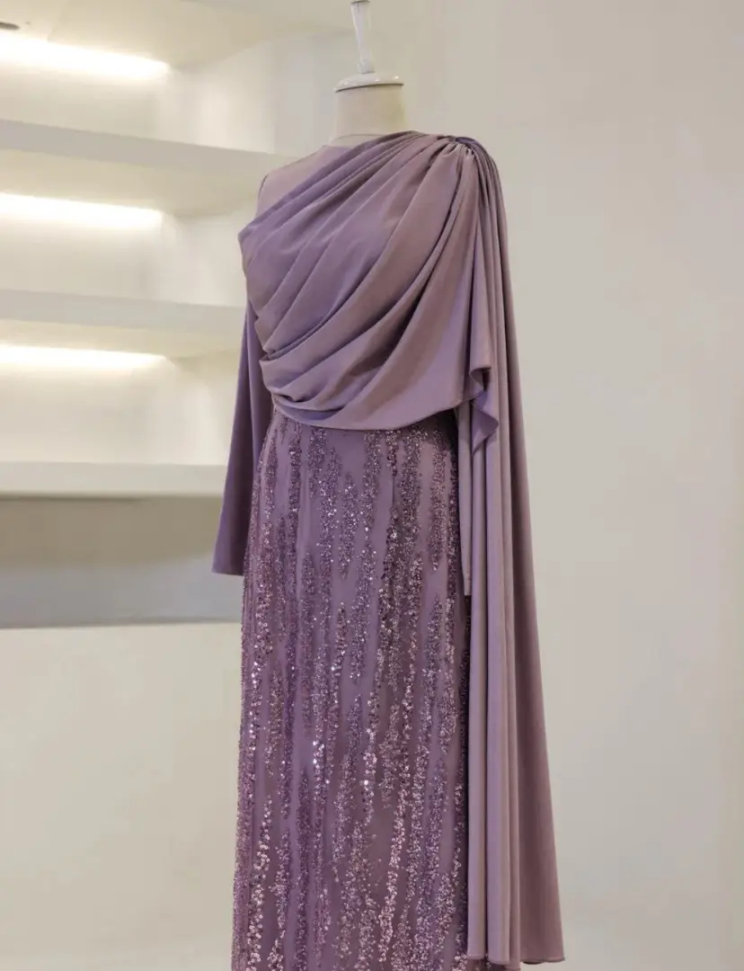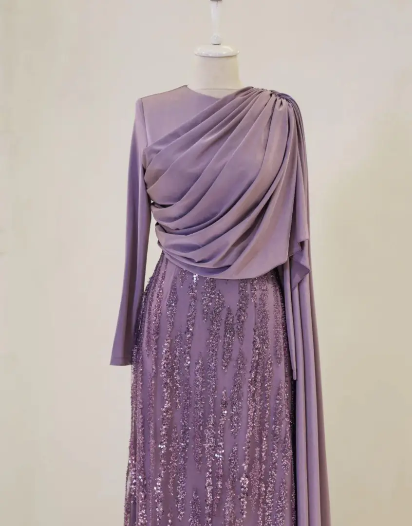 Sophisticated Draped Gown with a Soft Feminine Silhouette Celebrate beauty with our Selene Gown. This dress is designed to highlight elegant femininity with its sophisticated, figure-flatt ering draping. Crafted from high-quality fabric that offers oft, gentle shine, it creates a sweeping fluid silhouette. A perfect choice for understated luxury. Color Available: • Soft Lavender (Delicate and refined) Product Details: • Finish: Smooth, luxurious fabric with a beautiful soft sheen. • Design: Intricate draped detailing on the bodice with a flowing A-line skirt. • Sleeves: Elegant gathered cuffs with feminine puff sleeves. • Modesty: Fully lined, high neck, long sleeves. • Occasion: Ideal for special wedding guests, engagement parties, and elegant evenings.