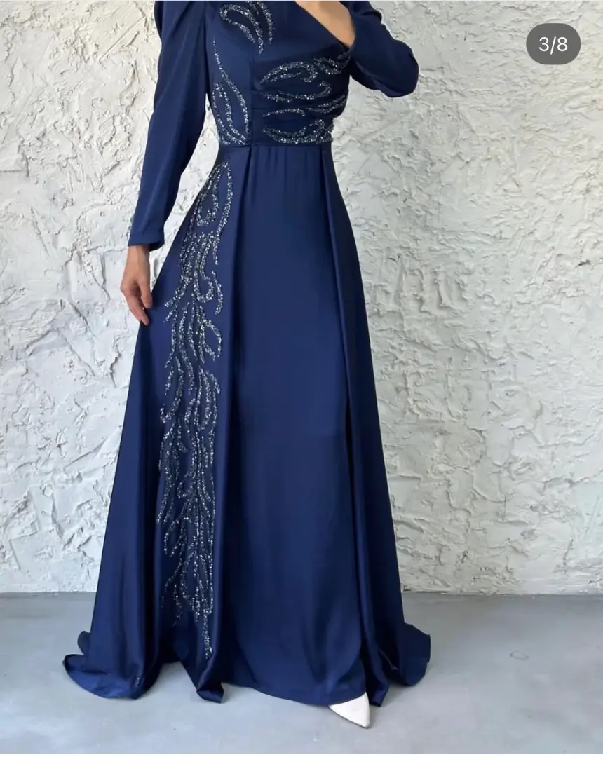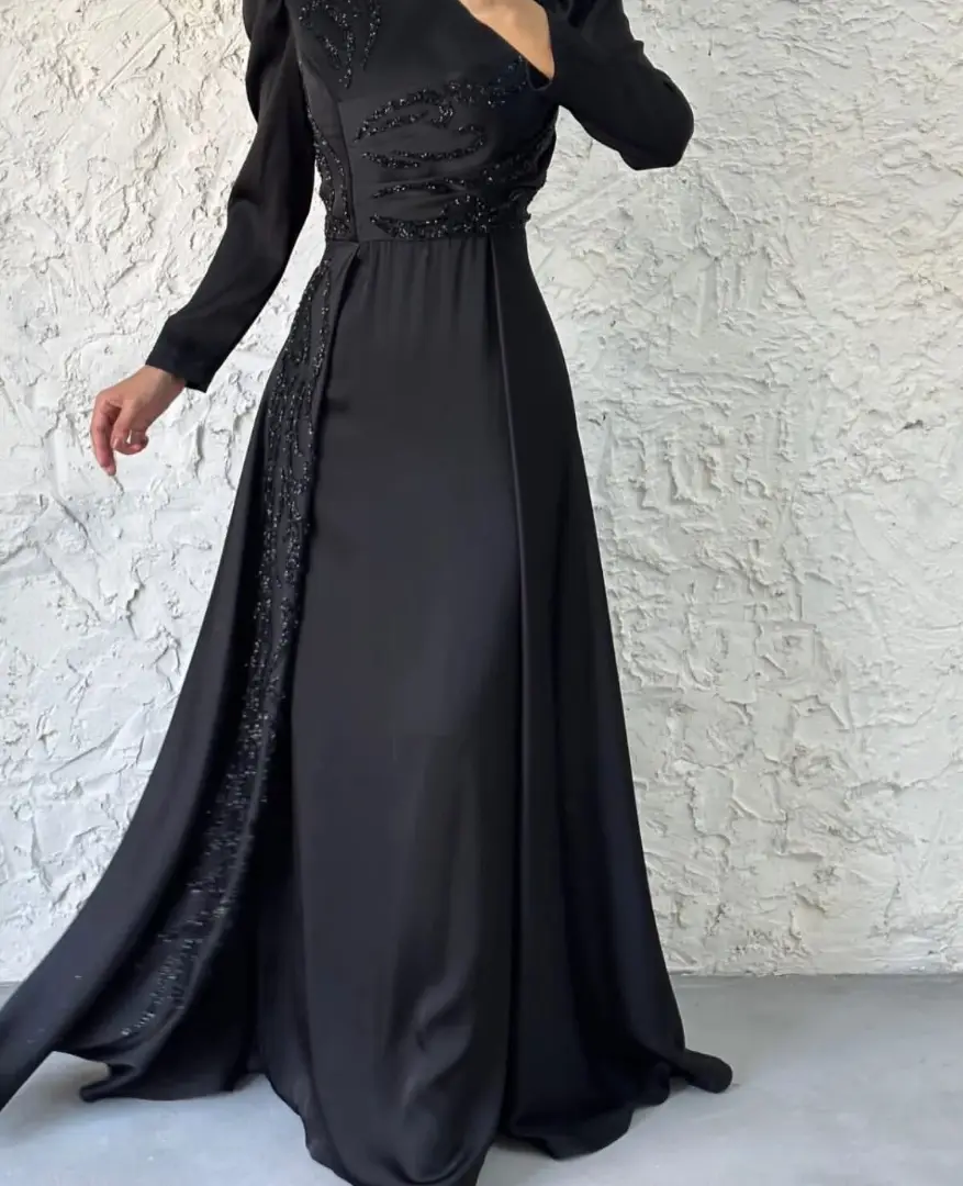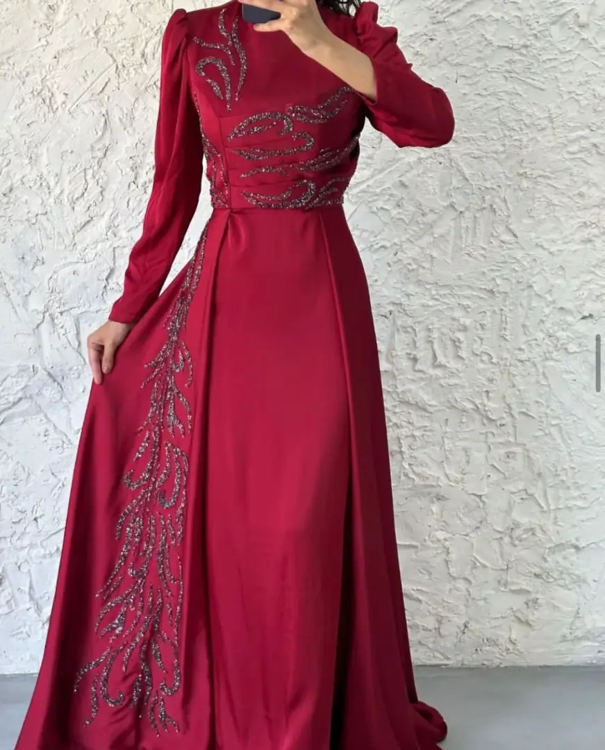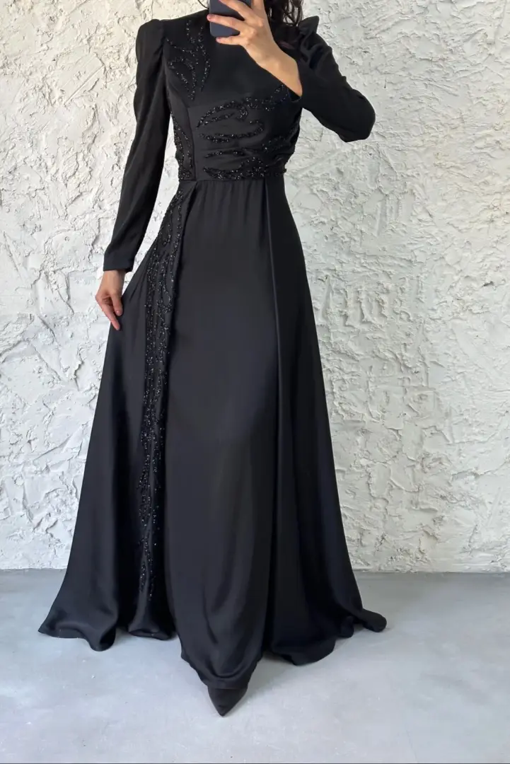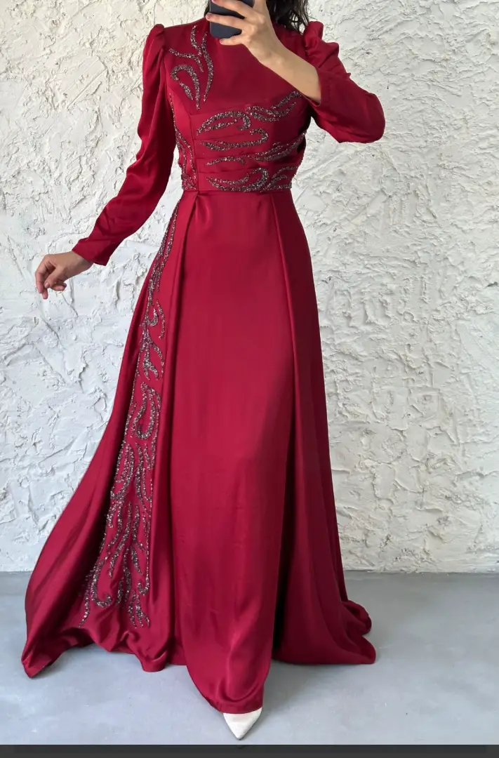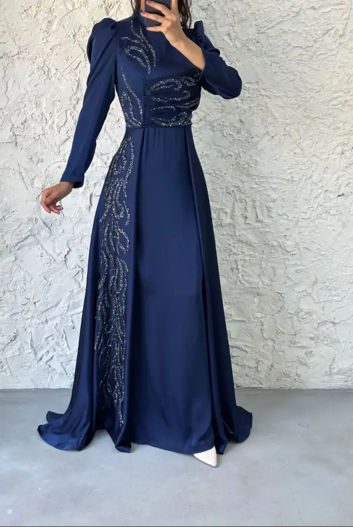 Luxurious Heavy Satin Gown with Side Crystal Artistry Step into pure radiance with the Glow Gown. This masterpiece is crafted from premium heavy satin, known for its rich luster and structured elegance. The highlight of this design is the intricate hand beaded crystal embroidery that cascades beautifully down the side, catching the light with every move. A timeless, modest silhouette designed for the most prestigiousevents. Available in 3 Stunning Colors: • Royal Indigo (Regal and deep) • Midnight Black (Classic and bold) • Rich Maroon (Sophisticated and warm) • Fabric: Premium heavy satin with a high-end finish. • Design: Unique side-cascading crystal embroidery for a modern, slimming effect. • Modesty: Fully lined, high neckline, and long sleeves. • Best for: Grand weddings, luxury galas, and formal soirées